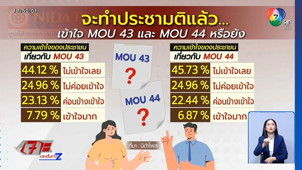 เจาะประเด็นข่าว 7HD - นิด้าโพล เปิดเผยความคิดเห็นประชาชนเรื่อง MOU 43 และ MOU 44 ส่วนใหญ่ยังไม่มีความเข้าใจ แต่เห็นด้วยที่จะทำประชามติยกเลิก ทั้ง MOU 43 และ MOU 44