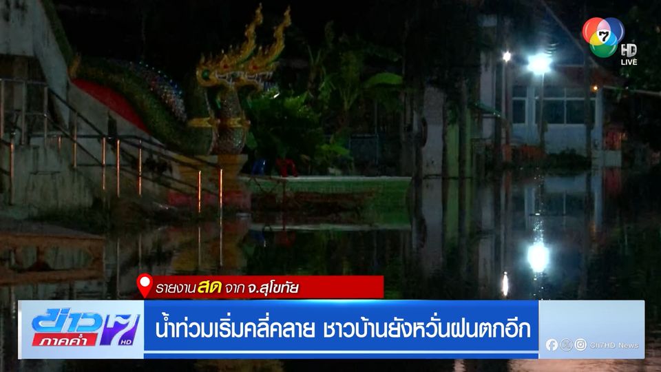 ข่าวภาคค่ำ - ด้านสถานการณ์น้ำท่วมที่อำเภอศรีนคร จังหวัดสุโขทัย หลายจุดเริ่มคลี่คลาย ชาวบ้านเริ่มทำความสะอาดบ้านเรือน แต่ก็กังวลเกิดฝนตกระลอกใหม่ ส่วนพระวัดราษฎร์ศรัทธาธรรม เร่งสูบน้ำให้ทันวันออกพรรษา ไปติดตามกับ คุณศิรัณพร มูลอุทก รายงานสถานการณ์จากจังหวัดสุโขทัย