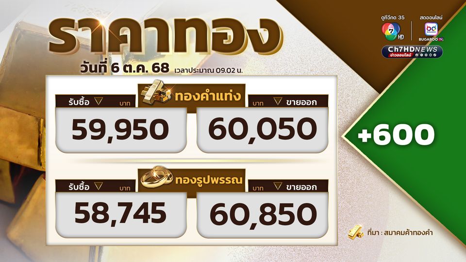 ราคาทอง โดยสมาคมค้าทองคำ รายงานราคาทองวันนี้ (6 ต.ค. 68) เปิดตลาดราคาทอง ปรับขึ้น 600 บาท ขายออกที่บาทละ 60,050 บาท โดยทองคำแท่งรับซื้อที่ 59,950 บาท ขายออกที่ 60,050 บาท ทองรูปพรรณรับซื้อที่ 58,745 บาท ขายออก 60,850 บาท