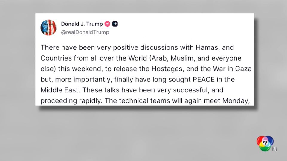 ประธานาธิบดีโดนัลด์ ทรัมป์ แห่งสหรัฐฯ โพสต์ข้อความผ่าน TRUTH SOCIAL ยืนยันว่า วานนี้ (5 ก.ย.) การเจรจากับกลุ่มฮามาสเพื่อยุติการสู้รบกับอิสราเอลในฉนวนกาซาและปล่อยตัวประกันที่เหลือทั้งหมดมีความคืบหน้าไปมากภายในเวลาอันรวดเร็ว และในวันนี้ตัวแทนทั้งสองฝ่ายจะประชุมร่วมกันที่อียิปต์ ซึ่งคาดว่าจะบรรลุข้อตกลงหยุดยิงขั้นแรกภายในสัปดาห์นี้