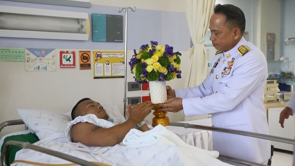 พระบาทสมเด็จพระเจ้าอยู่หัว พระราชทานดอกไม้และตะกร้าสิ่งของแก่ สิบโท บุริศวร์ ระดาชัย ที่ได้รับบาดเจ็บจากเหตุกลุ่มคนร้ายใช้อาวุธปืนยิงและบุกปล้นชิงทองคำร้านทองที่จังหวัดนราธิวาส