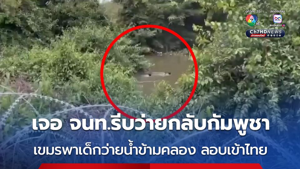 ชาวกัมพูชา พาเด็กเล็กว่ายน้ำข้ามคลอง หวังลักลอบเข้าไทย เจ้าหน้าที่ไทย มาพบ จึงตะโกนเตือนหวั่นเด็กจมน้ำ หลังจากนั้น ทั้งหมดจึงหันหลังว่ายกลับฝั่งกัมพูชาทันที