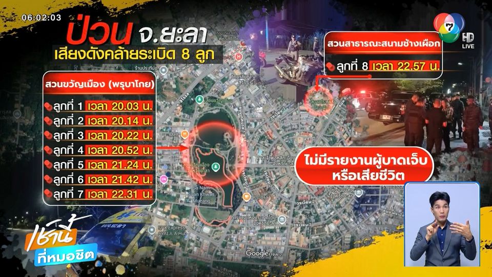 และลูกที่ 8 เวลา 22.57 น. สนามแบดมินตัน เทศบาลนครยะลาในสวนสาธารณะ สนามช้างเผือกห่างจาก จุด 1-7 ประมาณ 1.5 กิโลเมตร