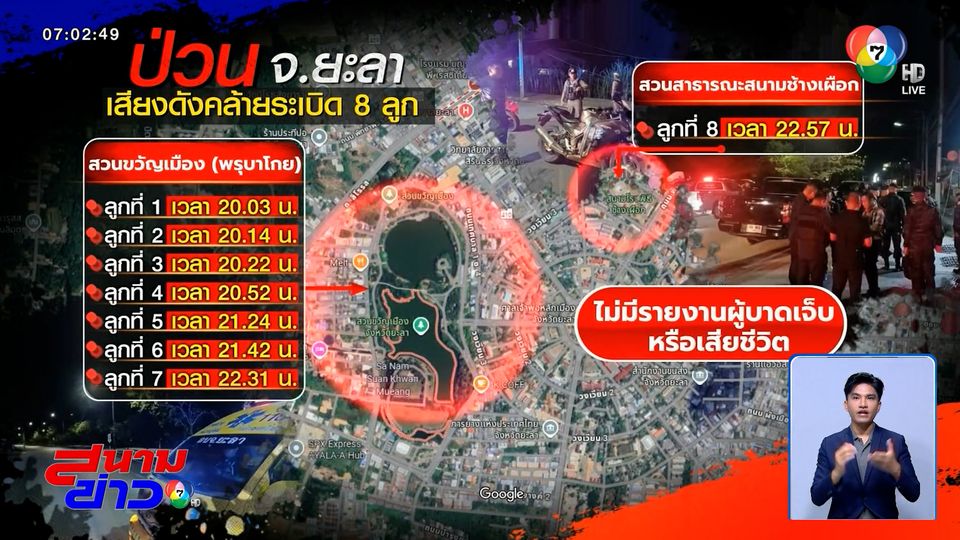 สนามข่าว 7 สี - สถานการณ์ชายแดนใต้ยังป่วนไม่เลิก เทศบาลนครยะลา แจ้งปิดสวนขวัญเมืองและสนามช้างเผือก หลังเมื่อคืนที่ผ่านมา เกิดเหตุระเบิดป่วน 8 จุด