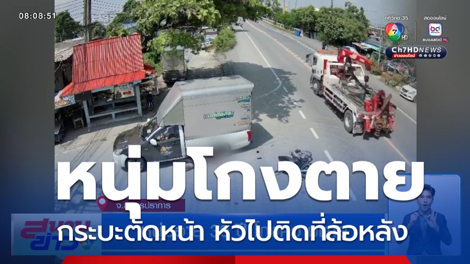 สนามข่าว 7 สี - รถจักรยานยนต์ถูกรถกระบะเลี้ยวเข้าซอยตัดหน้ากะทันหัน ทำให้เบรกจนรถล้ม หัวเข้าไปติดอยู่ใต้ล้อหลังรถกระบะ