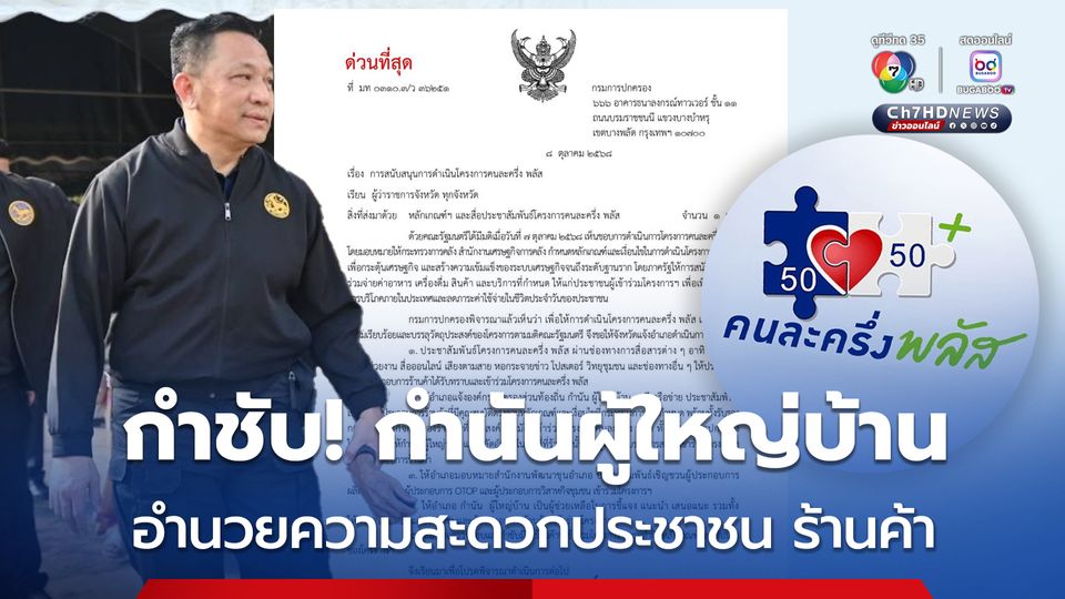 นายนิรัตน์ พงษ์สิทธิถาวร อธิบดีกรมการปกครอง ลงนามหนังสือด่วน วันที่ 8 ต.ค.68 ถึงผู้ว่าฯทุกจังหวัด ขอความร่วมมือ แจ้งไปยังอำเภอ ทั่วประเทศ สนับสนุนโครงการคนละครึ่ง พลัส 5 แนวทาง ตามนโยบายของรัฐบาลนายอนุทิน ชาญวีรกูล นายกรัฐมนตรี และรัฐมนตรีว่าการกระทรวงมหาดไทย ดังนี้