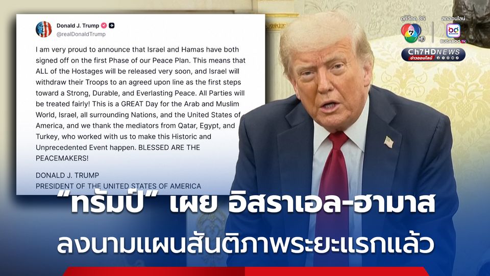 ประธานาธิบดี โดนัลด์ ทรัมป์ ของสหรัฐฯ ประกาศว่า “อิสราเอล” และ “ฮามาส” ได้ลงนามในแผนสันติภาพระยะแรกแล้ว นั้นหมายความว่าตัวประกันทั้งหมดจะได้รับการปล่อยตัว และ อิสราเอล จะเริ่มถอนกำลังทหาร