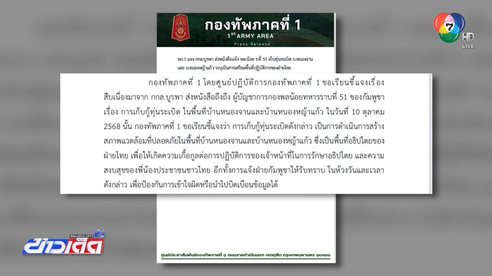 ข่าวเด็ด 7 สี - กองทัพภาคที่ 1 ย้ำเข้าพื้นที่บ้านหนองจาน บ้านหนองหญ้าแก้ว จังหวัดสระแก้ว อธิปไตยของไทย สร้างความปลอดภัยประชาชน กองกำลังบูรพา ทำหนังสือให้กัมพูชาทราบเกรงเข้าใจผิด