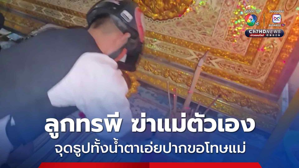 ลูกคลั่ง ฆ่าแม่บังเกิดเกล้า ตำรวจคุมตัวทำแผน พร้อมจุดธูปขอขมาหน้าศพแม่ ขณะจุดธูป ลูกชายที่ก่อเหตุ ร่ำไห้ พร้อมกล่าวบอกแม่ "ผมขอโทษ ขอไปสู่สุขติ" ขณะที่ พ่อผู้ขอเหตุ ประกาศตัดความสัมพันธ์กับลูกชาย ขอให้ติดคุกตลอดชีวิต