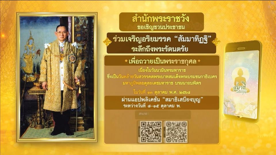 สำนักพระราชวัง ขอเชิญชวนประชาชนร่วมเจริญอริยมรรค "สัมมาทิฏฐิ" ระลึกถึงพระรัตนตรัย ว่าเป็นสรณะที่พึ่งที่ยึดถือ อันเป็นทางเป็นธรรมที่พระพุทธองค์ได้ตรัสไว้โดยชอบ เพื่อถวายเป็นพระราชกุศล เนื่องในวันนวมินทรมหาราช ซึ่งเป็นวันคล้ายวันสวรรคต พระบาทสมเด็จพระบรมชนกาธิเบศร มหาภูมิพลอดุลยเดชมหาราช บรมนาถบพิตร ในวันที่ 13 ตุลาคม 2568 ผ่านแอปพลิเคชัน "สมาธิเสบียงบุญ" ระหว่างวันที่ 8-15 ตุลาคม 2568 ทั้งนี้ สามารถดาวน์โหลดแอปพลิเคชันได้ทั้ง Play Store และ App store