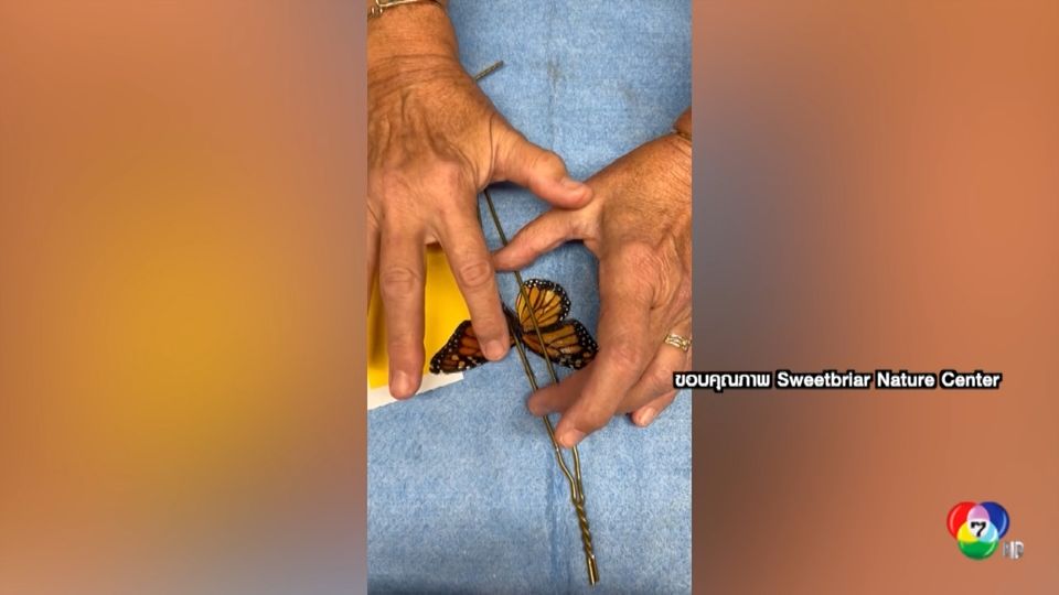 เจ้าหน้าที่ 2 คน ของศูนย์อนุรักษ์ธรรมชาติสวีตไบรเออร์ (Sweetbriar Nature Center) ในเมืองสมิธทาวน์ รัฐนิวยอร์ก ของสหรัฐฯ ช่วยกันผ่าตัดเปลี่ยนปีกให้กับผีเสื้อจักรพรรดิ หรือผีเสื้อโมนาร์ช (Monarch butterfly) ตัวหนึ่ง ที่ปีกหักจนบินไม่ได้ โดยเจ้าหน้าที่ใช้อุปกรณ์ธรรมดา ๆ อย่าง กรรไกร, กาว, แป้งข้าวโพด และปีกจากผีเสื้อที่ตายแล้ว