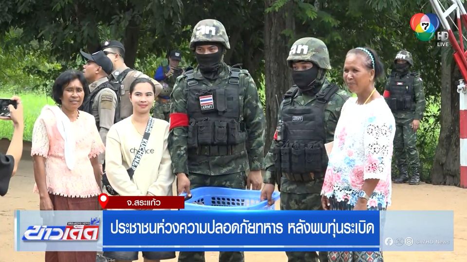 ข่าวเด็ด 7 สี - มวลชนชาวไทยหลั่งไหลเข้าให้กำลังใจเจ้าหน้าที่ทหารแนวชายแดน ในจังหวัดสระแก้ว อย่างต่อเนื่อง แต่หลายคนเป็นห่วงความปลอดภัย หลังพบทุ่นระเบิดสังหารบุคคลที่บ้านหนองหญ้าแก้ว 3 ทุ่น