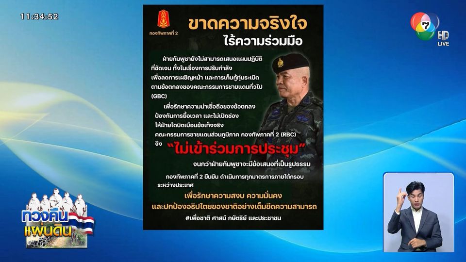 ห้องข่าวภาคเที่ยง - ส่วนการแก้ปัญหาชายแดนไทย-กัมพูชา ที่ล่าสุดเวทีการประชุม RBC ระหว่างกองทัพภาคที่ 2 กับภูมิภาคทหารที่ 4 ของกัมพูชา ต้องล้มโต๊ะถกกันไปแบบไม่มีกำหนด เหตุเพราะกัมพูชา ไร้ความจริงใจ ไม่เสนอแผนปฏิบัติถอนอาวุธและเก็บกู้ทุ่นระเบิด ด้าน กัมพูชา อัดคลิปออกมาโวย ไทยไม่มาประชุม จนต้องรื้อเต็นท์