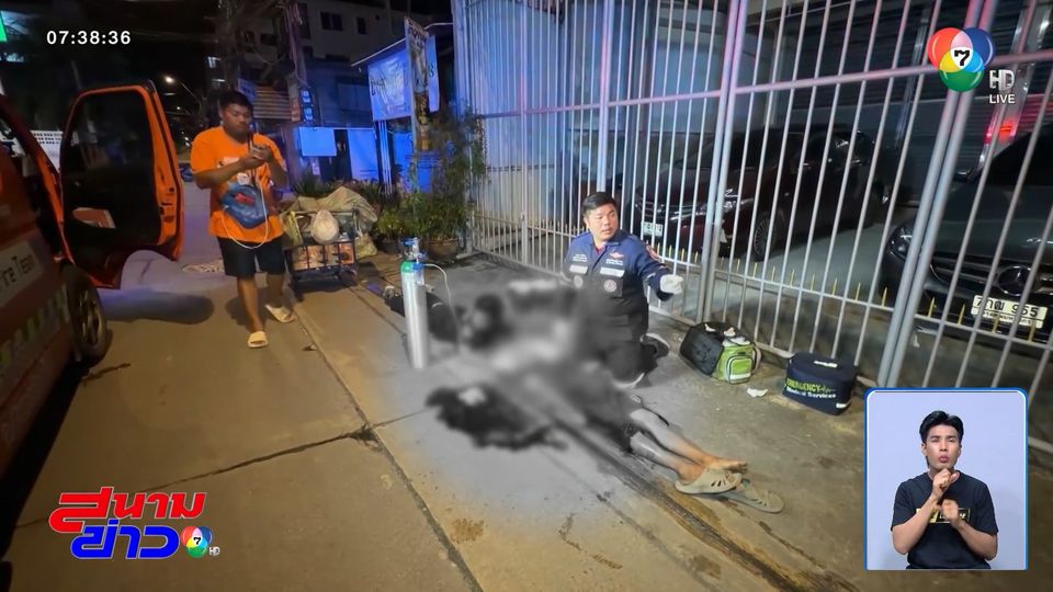 เจ้าหน้าที่มูลนิธิฯ เข้าปฐมพยาบาล นางทองจันทร์ อายุ 50 ปี ซึ่งนอนคว่ำหน้าบาดเจ็บอยู่ริมถนน ภายในซอยแบริ่ง 48 โดยถูกยิงเข้าที่ศีรษะด้านซ้าย 1 นัด อาการสาหัส และหมดสติ มีเลือดไหลนองพื้นเป็นจำนวนมาก
