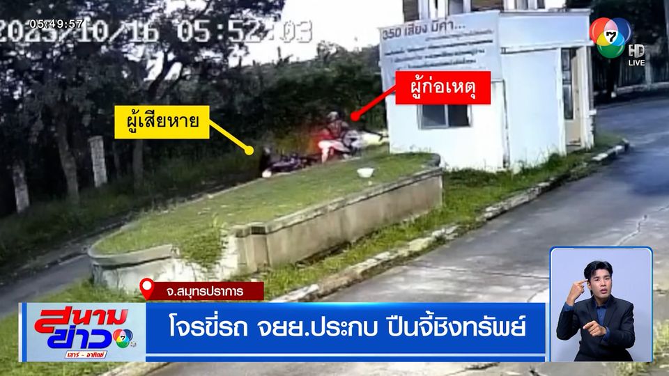 กล้องวงจรปิดถนนในหมู่บ้านแห่งหนึ่ง อำเภอบางพลี จังหวัดสมุทรปราการ บันทึกภาพขณะโจรขี่รถจักรยานยนต์ตามประกบผู้หญิง ที่ขี่รถมาคนเดียว และมีการยิงปืนขู่ 1 นัด ก่อนเร่งเครื่องรถขึ้นไปดักหน้า จนถึงป้อม รปภ.หน้าทางเข้าหมู่บ้าน โจรได้ชักปืนจี้ บังคับให้ส่งกระเป๋าพร้อมของมีค่า ถ้าไม่อยากถูกยิง หลังได้ทรัพย์สินโจรรีบขี่รถหลบหนี เหตุเกิดใกล้ 06.00 น. ของวันที่ 16 ตุลาคม ที่ผ่านมา