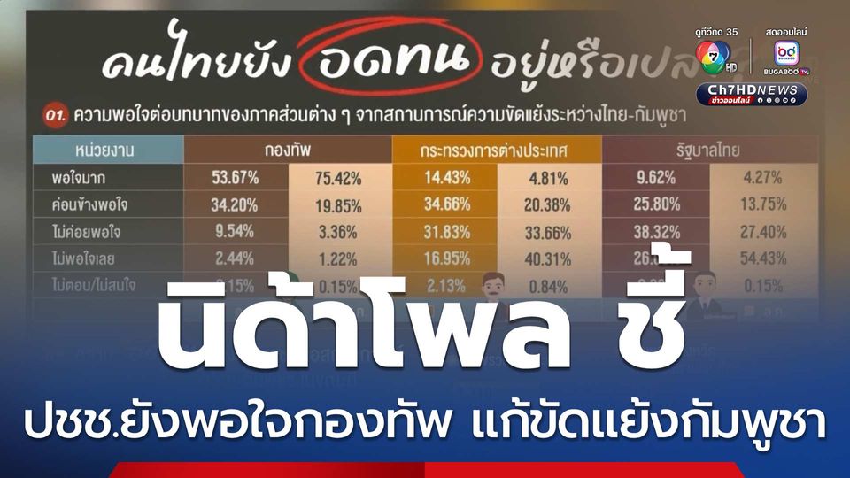 ข่าวเด็ด 7 สี - ผลสำรวจประชาชนต่อสถานการณ์ความขัดแย้งกับกัมพูชาในเดือนตุลาคม ยังพอใจบทบาทของกองทัพเกินครึ่ง และยังเห็นว่าต้องกดดันทางเศรษฐกิจต่อไป