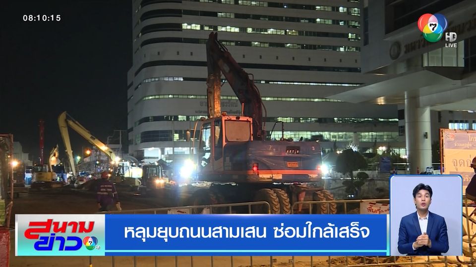 สนามข่าว 7 สี - หลุมยุบที่ถนนสามเสนหน้าวชิรพยาบาล ตอนนี้แทบจะไม่เหลือเค้าเดิมแล้ว อีกไม่กี่เซนติเมตร จะเข้าสู่ขั้นตอนการลาดยางมะตอย ก็จะซ่อมเสร็จ รอการทดสอบชั้นดินและทรายในหลุมว่าแน่นหนาพอหรือไม่