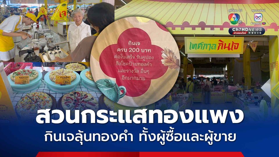 สำหรับไฮไลก์ปีนี้คือกินเจแจกทองสวนกระแสราคาทองคำแพง เพราะเจ้าของตลาดอยากเป็นกำลังใจให้คนกินเจให้ตลอดทั้งเทศกาล จึงมีรางวัลป้ายทองคำสำหรับลูกค้าซื้ออาหารเจภายในงานครบ 200 บาท รับคูปอง 1 ใบ เขียนชื่อ ที่อยู่ เบอร์โทร จับแจกทองวัน 29 ต.ค. 68 เป็นรางวัลป้ายทองคำหนัก 1 กรัม มลูค่าประมาณ 5,000 บาท 1 รางวัล และสำหรับรางวัลร้านค้า แจกป้ายทองคำหนัก 1 กรัม 1 รางวัล มลูค่า 5,000 บาท และเครื่องใช้ไฟฟ้าแจกทุกวัน รวมทั้งของที่ระลึกอีกมากมาย อยากให้คนกินเจมีความสุข กินได้ทุกวัน 10 วันต้องให้ครบ ถูกดี มีกำลังใจ สุขภาพดีไปด้วยกัน อิ่มท้อง อิ่มอร่อย อิ่มบุญ