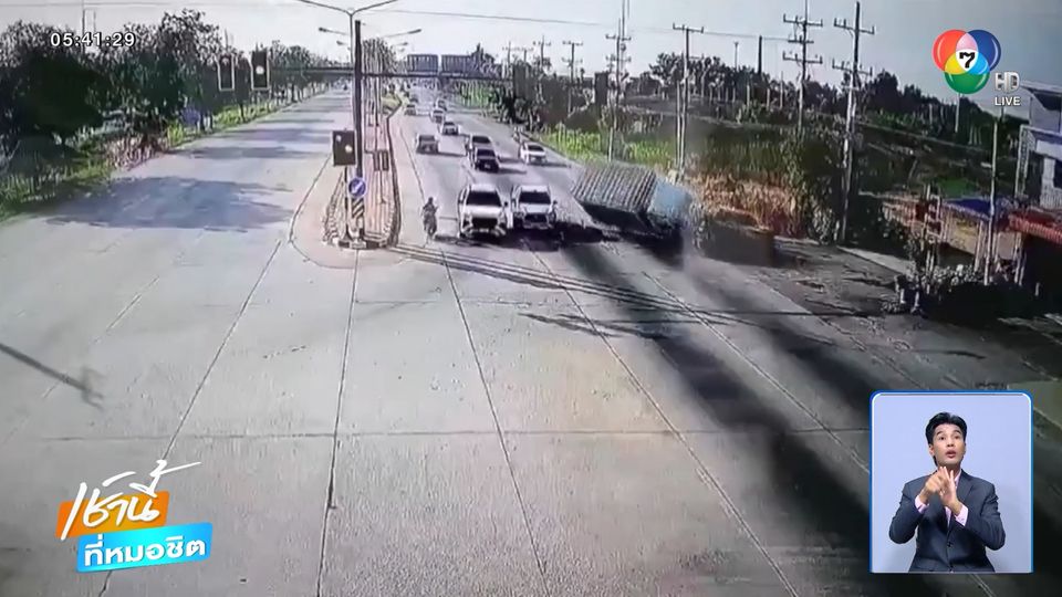 เช้านี้ที่หมอชิต - นาทีรถบรรทุกเบรกแตก พุ่งชนรถกระบะ 2 คัน ที่กำลังชะลอจอดติดไฟแดง จนกระเด็นชนรถจักรยานยนต์ มีผู้บาดเจ็บสาหัส 1 คน