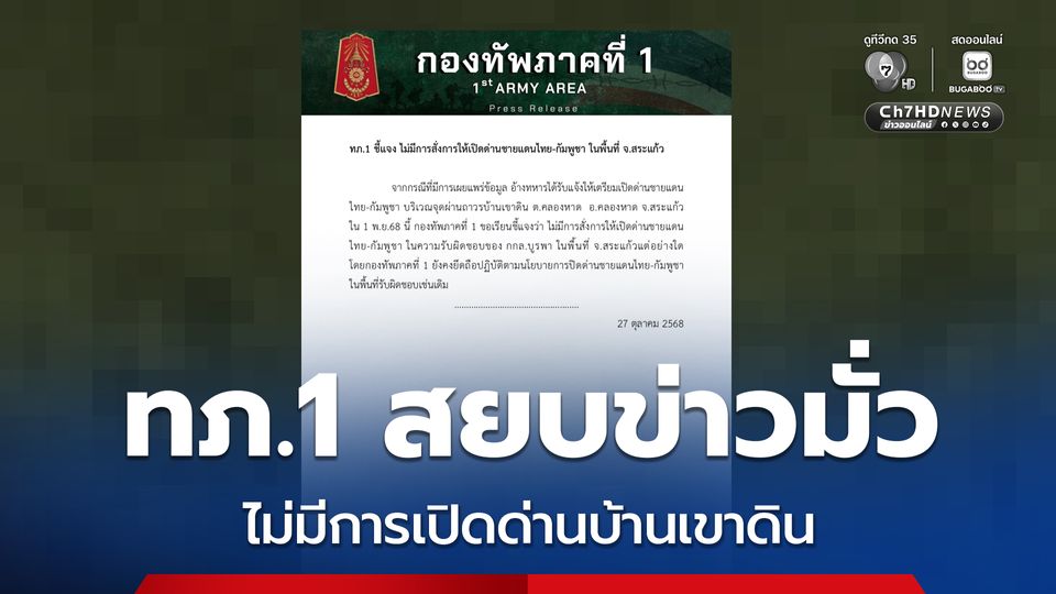 โดยทางกองทัพภาคที่ ชี้แจงว่า จากกรณีที่มีการเผยแพร่ข้อมูล อ้างทหารได้รับแจ้งให้เตรียมเปิดด่านชายแดนไทย-กัมพูชา บริเวณจุดผ่านแดนถาวรบ้านเขาดิน ต.คลองหาด อ.คลองหาด จ.สระแก้ว ใน 1 พ.ย.68 นี้ กองทัพภาคที่ 1 ขอเรียนชี้แจงว่า ไม่มีการสั่งการให้เปิดด่านชายแดนไทย-กัมพูชา ในความรับผิดชอบของ กกล.บูรพา ในพื้นที่ จ.สระแก้วแต่อย่างใด