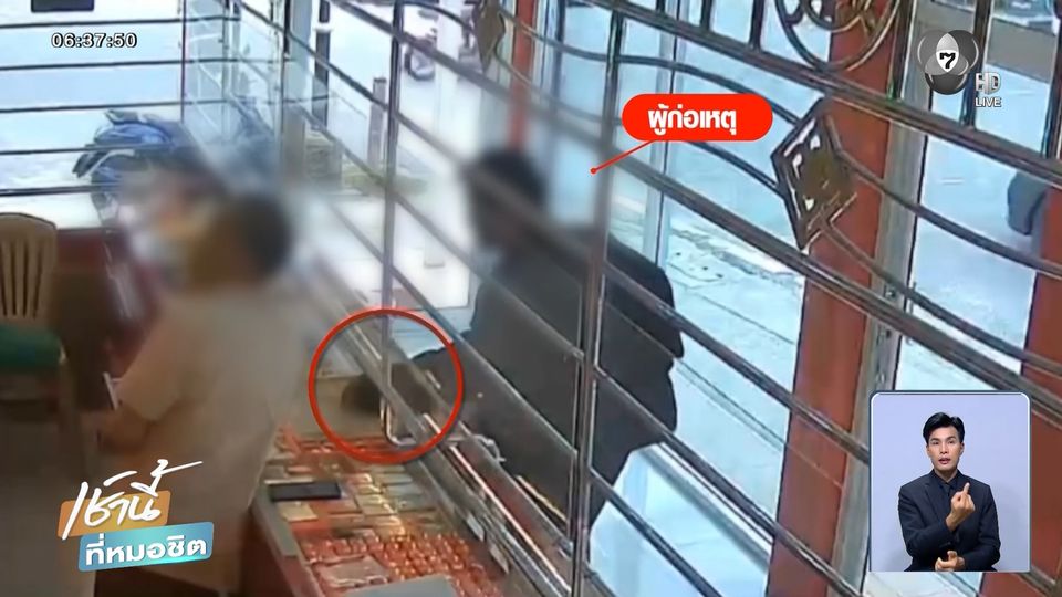 เป็นภาพจากกล้องวงจรปิดที่ติดตั้งไว้ในร้านทองแห่งหนึ่ง ในพื้นที่ชุมชนบ้านโขดหิน-เขาไผ่ ตำบลเนินพระ อำเภอเมือง จังหวัดระยอง ที่บันทึกภาพชายสวมเสื้อแจ็กเกตสีดำ เข้าไปเลือกซื้อสร้อยคอทองคำ เจ้าของร้านจึงนำสร้อยคอทองคำออกมาให้เลือก จำนวน 5 เส้น น้ำหนักเส้นละ 1 บาท