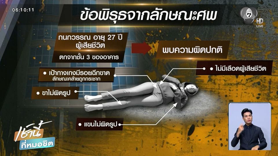 ทำให้ทั้งญาติ เจ้าหน้าที่และตำรวจฝั่งไทย ติดใจการเสียชีวิตที่ผิดปกติ สงสัยอาจเป็นคดีฆาตกรรม มากกว่าจะฆ่าตัวตายเอง เพราะหน้าต่างของอาคาร ที่ผู้ตายตกลงมา มีขนาดที่แคบ ขณะเกิดเหตุก็มีหน้าต่างชั้น 3 และชั้น 4 เปิดอยู่เท่านั้น