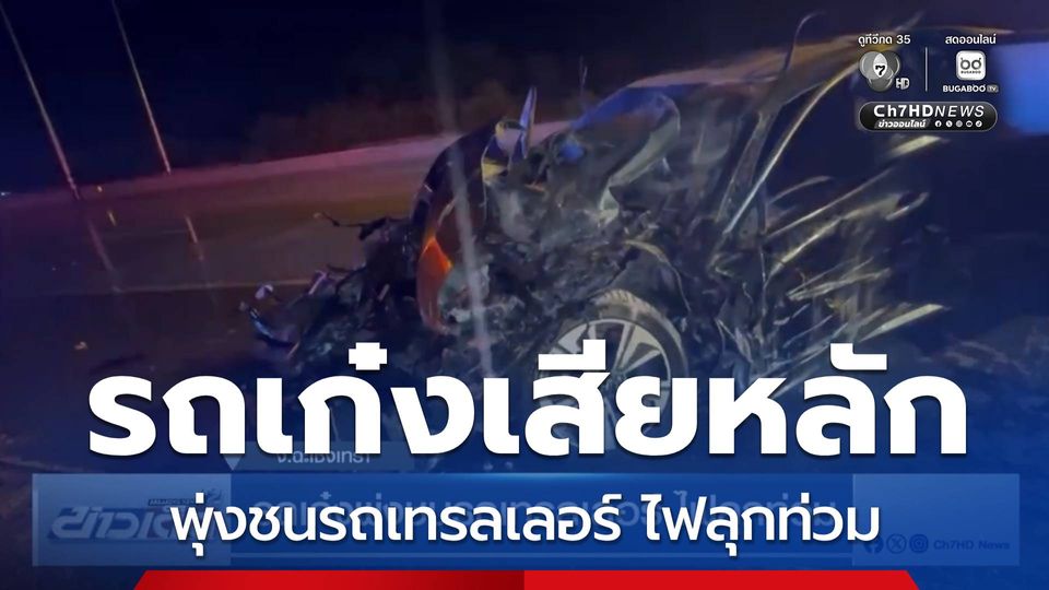 ข่าวเด็ด 7 สี - เหตุระทึก เพลิงลุกไหม้รถเก๋ง ที่เสียหลักพุ่งชนกับรถเทรลเลอร์ที่จอดอยู่ข้างทาง จนไฟลุกท่วม คนขับรถเก๋งได้รับบาดเจ็บสาหัส