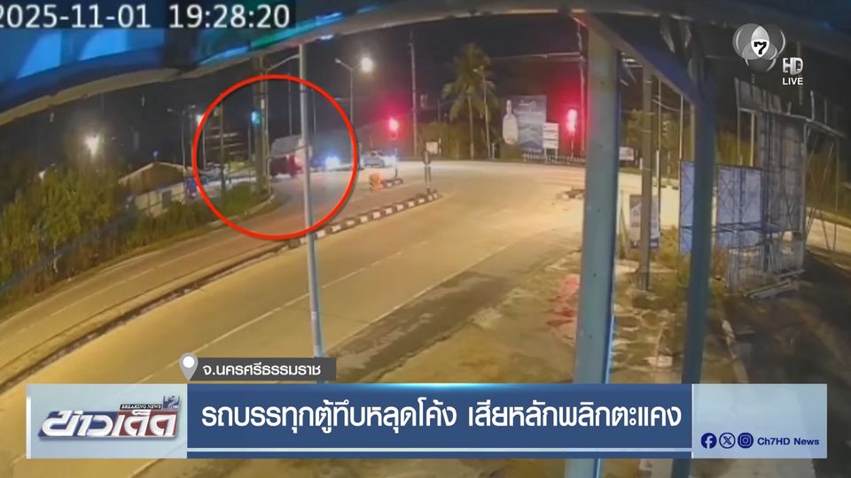 ข่าวเด็ด 7 สี - ฝนตกเป็นเหตุ รถบรรทุกตู้ทึบขับมาบนถนนก่อนเสียหลักหลุดโค้ง พลิกตะแคงขวางถนน ที่จังหวัดนครศรีธรรมราช
