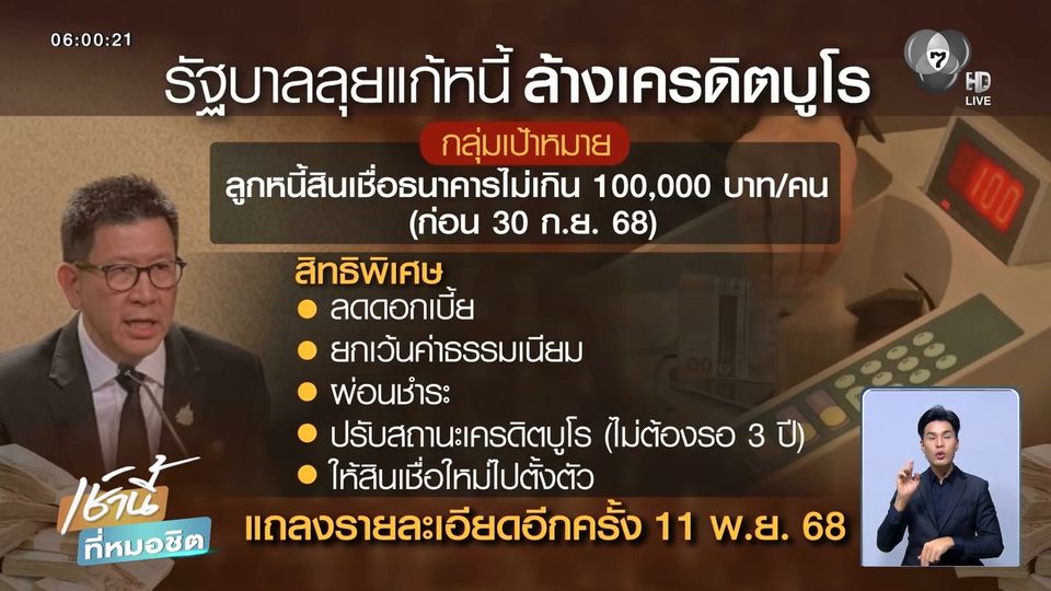 เช้านี้ที่หมอชิต - ข่าวดีของลูกหนี้ รัฐบาลเดินหน้าแก้ไขปัญหาภาระหนี้ของประชาชน ซึ่งกระทบหนักจนกลายเป็นปัญหาสังคม และระบบเศรษฐกิจของไทย โดยเมื่อวาน "นายกฯ อนุทิน" นั่งหัวโต๊ะเป็นประธานการประชุมคณะกรรมการนโยบายเศรษฐกิจ และได้มีการเคาะมาตรการสำคัญเกี่ยวกับการแก้ไขหนี้
