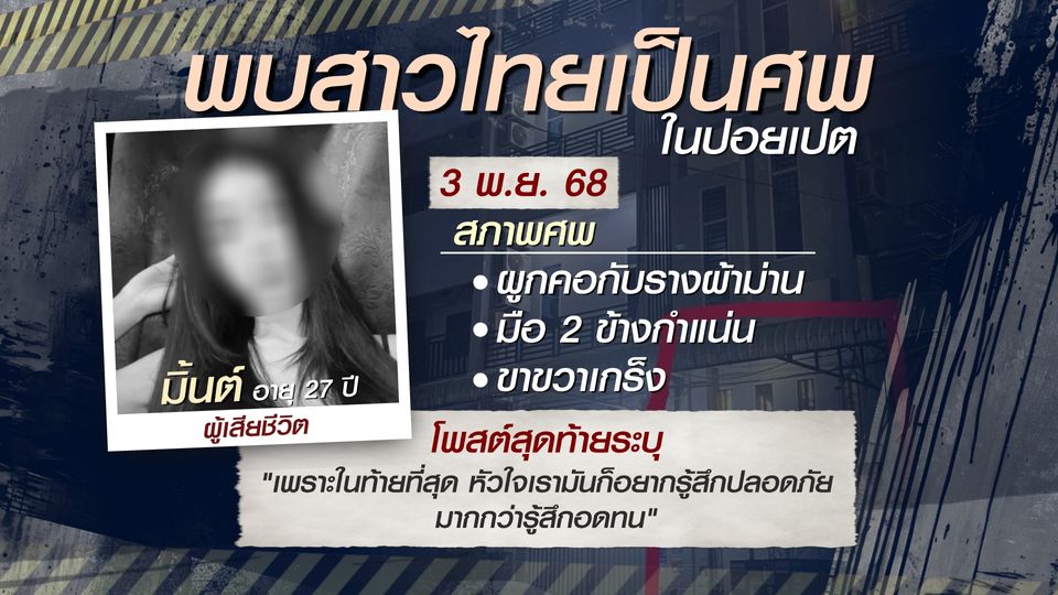 ถูกจับตามองว่าเป็นผู้เสียชีวิตรายที่ 2 แล้ว ที่มีเจ้าหน้าที่ไปพบศพหญิงไทย เสียชีวิตในจังหวัดบันเตียเมียนเจย เมืองปอยเปต ประเทศกัมพูชา โดยหญิงไทยคนนี้ชื่อว่า "มิ้นต์" หรือ นางสาวสุธาทิพย์ อายุ 27 ปี