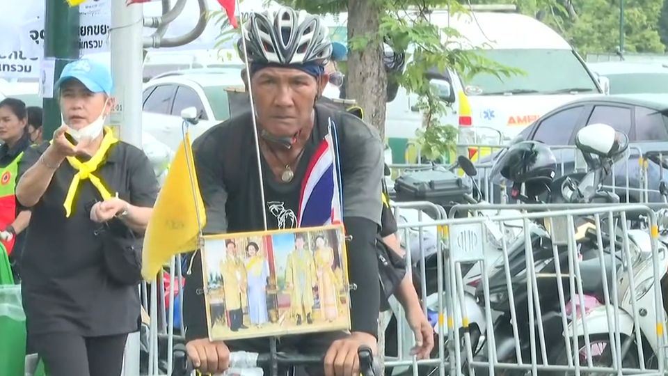 นายมิตร ธรรมลุน อายุ 54 ปี ชาวจังหวัดสุราษฎร์ธานี ปั่นจักรยานคู่ใจ ออกจากบ้านเกิดเมื่อวันที่ 31 ตุลาคม ค่ำไหน นอนนั่น ระยะทางไกลกว่า 650 กิโลเมตร ใช้เวลาเดินทาง 5 วัน เมื่อบ่ายวานนี้ถึงท้องสนามหลวงตามที่ตั้งใจ เพื่อเข้าสักการะแสดงความอาลัยต่อแม่ของแผ่นดิน