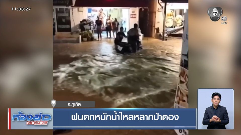 น้ำเพิ่มสูงและดูจะไหลแรงทีเดียว คนขี่รถจักรยานยนต์ต้องประคองไว้จนเกือบล้มลง ถังสีฟ้าที่เห็นน่าจะเป็นถังใส่น้ำแข็งลอยไปกับกระแสน้ำ ภายในชุมชนนาใน ซอย 8 และพื้นที่ใกล้เคียง ตำบลป่าตอง อำเภอกะทู้ จังหวัดภูเก็ต เนื่องจากเกิดฝนตกหนักติดต่อกันนานหลายชั่วโมง ในคืนลอยกระทงเมื่อคืน