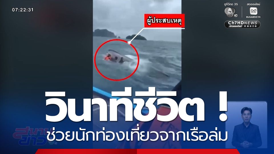 สนามข่าว 7 สี - คลื่นลมแรงซัดเรือนำเที่ยว ล่มกลางทะเลที่จังหวัดกระบี่ นักท่องเที่ยวและไกด์ต้องเกาะเรือลอยคอ รอความช่วยเหลือ