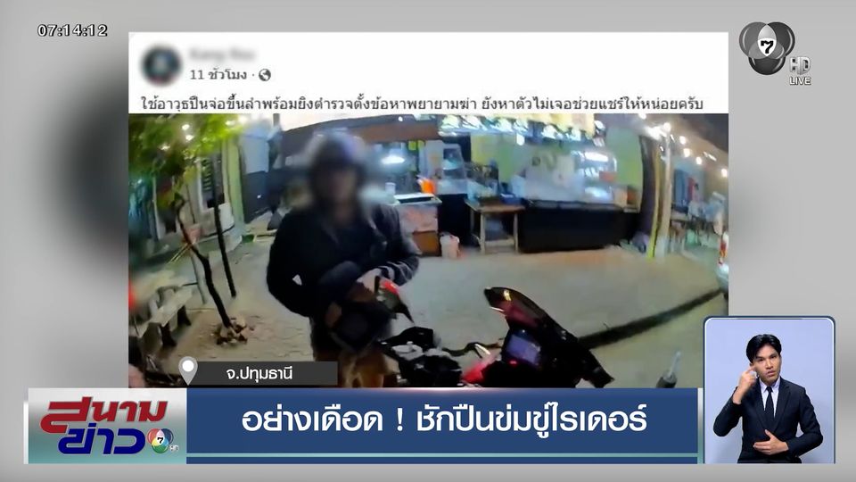 สนามข่าว 7 สี - หนุ่มหัวร้อนชักปืนขึ้นลำ ข่มขู่ไรเดอร์กลางถนน พื้นที่จังหวัดปทุมธานี อ้างว่าไรเดอร์ขี่รถเบียด