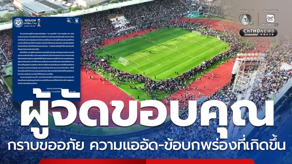 สนามข่าว 7 สี - ช่อง 7HD ขอบคุณทุกกระแสในความชื่นชมจัดการแข่งขันฟุตบอลนักเรียน 7 คน แชมป์กีฬา 7HD แชมเปียน คัพ 2025 และกราบขออภัยเป็นอย่างสูง สำหรับเหตุการณ์ความแออัดและข้อบกพร่องที่เกิดขึ้น
