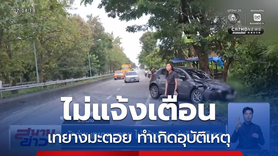 สนามข่าว 7 สี - กระแสดรามา เกิดอุบัติเหตุรถยนต์หลายคันเสียหลักเลื่อนไถลตกข้างทางใน จังหวัดลำปาง สาเหตุเกิดจากผู้รับเหมาซ่อมถนนลาดยางมะตอย ไร้ป้ายแจ้งเตือนประชาชน