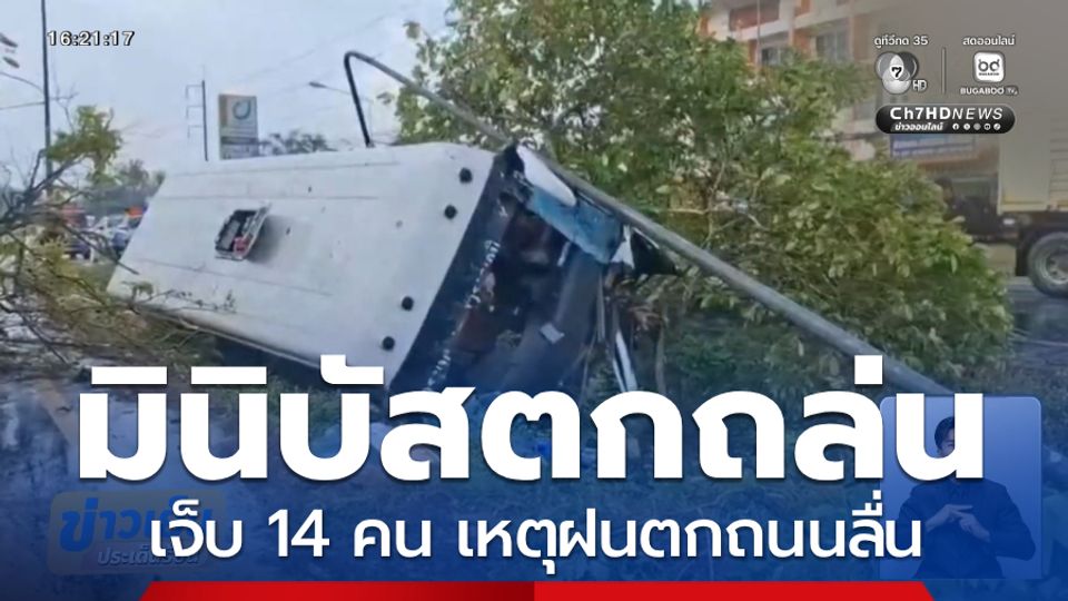 ข่าวเย็นประเด็นร้อน - ช่วงนี้ต้องขับรถอย่างระมัดระวัง ฝนตกหนักถนนลื่น เกิดเหตุรถมินิบัสลื่นไถล เสียหลักชนต้นไม้ พุ่งตกร่องกลางถนน ที่จังหวัดระยอง มีผู้บาดเจ็บ 14 คน