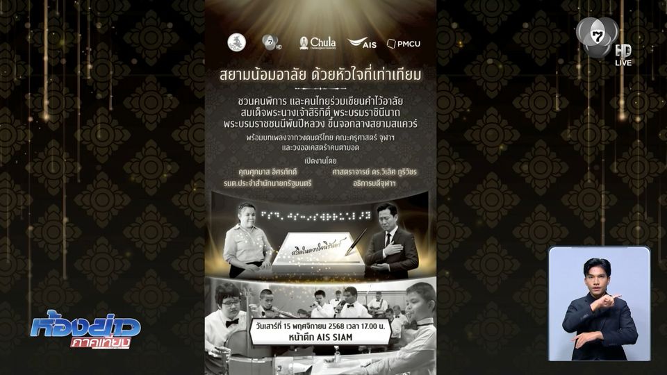 กรมประชาสัมพันธ์ จุฬาลงกรณ์มหาวิทยาลัย สำนักงานทรัพย์สินจุฬาฯ ช่อง 7HD และเอไอเอส ร่วมจัดกิจกรรมเนื่องในวันคนพิการแห่งชาติ "สยามน้อมอาลัย ด้วยหัวใจที่เท่าเทียม" ชวนประชาชน และผู้พิการ ร่วมกิจกรรมในวันเสาร์ที่ 15 พฤศจิกายนนี้ เวลา 17.00 น. เป็นต้นไป บริเวณหน้าอาคาร AIS SIAM, Siam Square Walking Street