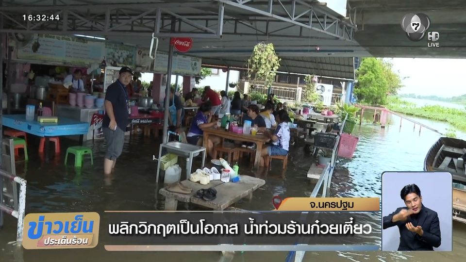 ข่าวเย็นประเด็นร้อน - ร้านก๋วยเตี๋ยวพลิกวิกฤตเป็นโอกาสหลังน้ำท่วม ขายดีเป็นเทน้ำเทท่า คือ ร้านตั้งอยู่ริมแม่น้ำท่าจีน เปิดให้กินไป ปล่อยให้ปลาตอดเท้าไป ฟินเหมือนทำสปา