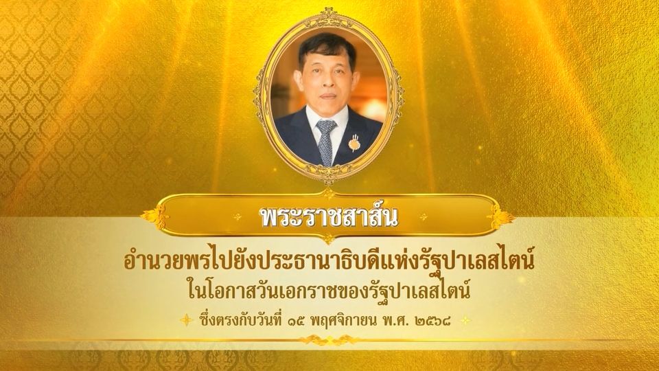 ในโอกาสวันเอกราชของรัฐปาเลสไตน์ ข้าพเจ้าขอส่งคำอำนวยพรและความปรารถนาดีด้วยใจจริง เพื่อพลานามัยที่สมบูรณ์แข็งแรงและความสุขสวัสดีของท่านประธานาธิบดี ทั้งเพื่อสันติสุข การยืนหยัดมั่นคง และความเจริญรุ่งเรืองของประเทศและประชาชนชาวปาเลสไตน์
