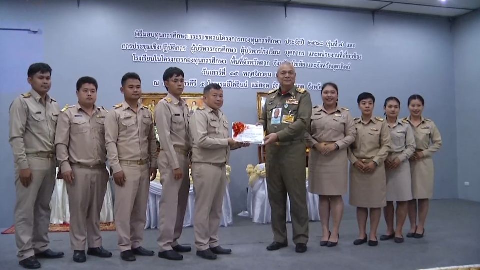 โอกาสนี้ องคมนตรีเป็นประธานในพิธีมอบทุนการศึกษาพระราชทานโครงการกองทุนการศึกษา ประจำปี 2568 รุ่นที่ 7 แก่นักเรียนฯ ที่มีคุณสมบัติตามเกณฑ์ 5 คน จากโรงเรียน 5 แห่ง ได้แก่ โรงเรียนบ้านสามหมื่น และโรงเรียนบ้านกล้อท้อ จังหวัดตาก, โรงเรียนบ้านโซกม่วง และโรงเรียนบ้านบ่อเบี้ย จังหวัดสุโขทัย, กับโรงเรียนบ้านห้วยยาง จังหวัดอุตรดิตถ์ เพื่อให้เด็กนักเรียนที่ยากจน แต่มีความประพฤติดีให้ได้รับโอกาสทางการศึกษา มีทัศนคติที่ถูกต้อง มีคุณธรรม จริยธรรม พร้อมที่จะเติบโตเป็นพลเมืองที่ดี สามารถสร้างประโยชน์ให้แก่ตนเอง ครอบครัว ชุมชน และประเทศชาติสืบไป