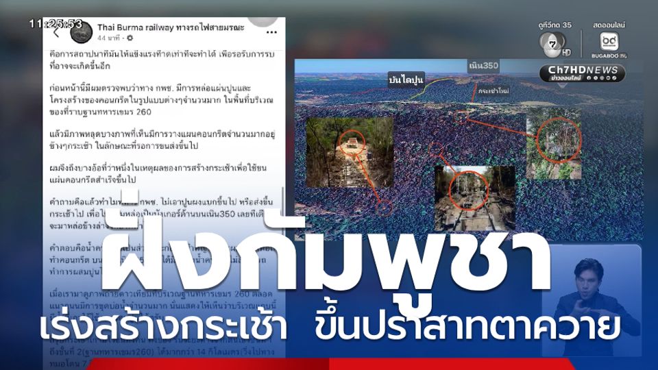 ห้องข่าวภาคเที่ยง - ความเคลื่อนไหวฝั่งกัมพูชา ล่าสุดพบทางการกัมพูชา เร่งสร้างกระเช้า เพื่อขึ้นปราสาทตาควาย คาดว่าใช้ขนส่งอาวุธ และอุปกรณ์ทำบังเกอร์