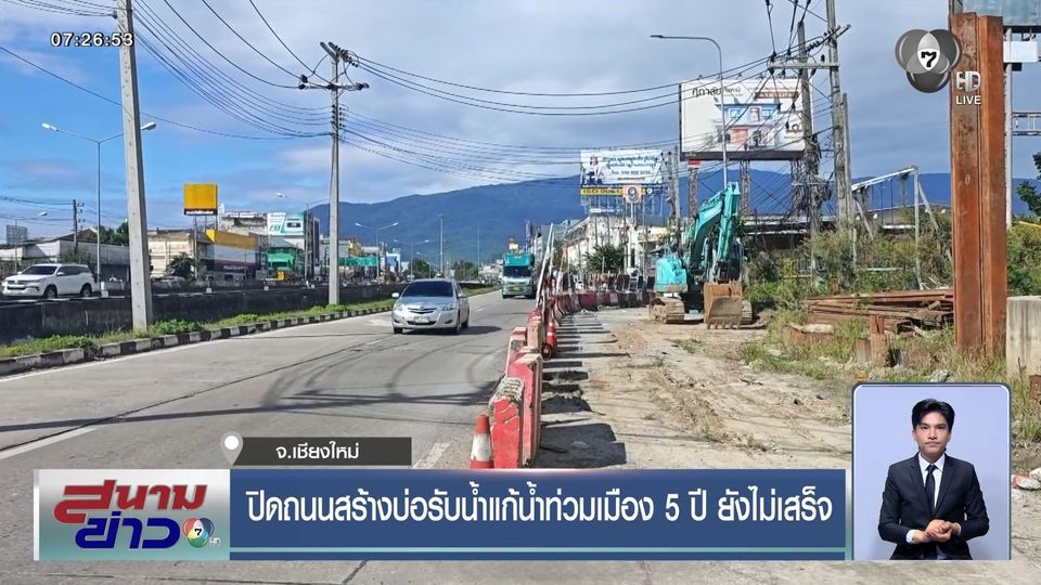 สนามข่าว 7 สี - ที่ จังหวัดเชียงใหม่ ชาวบ้านสงสัยเรื่องปิดถนนสร้างบ่อรับน้ำ แก้ปัญหาน้ำท่วมเมือง ผ่านมา 5 ปี ยังสร้างไม่เสร็จ กระทบการจราจรบนทางหลวง