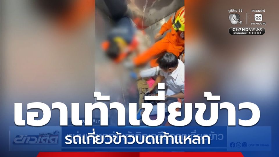 ข่าวเด็ด 7 สี - ชายหนุ่มลงไปในปล่องรถเกี่ยวข้าว หวังใช้เท้าเขี่ยข้าวที่ติดอยู่ แต่เกิดพลาดรองเท้าบูทพันกับเกลียว จนได้รับบาดเจ็บ