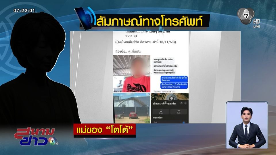 สนามข่าว 7 สี - ตามต่อกับเหยื่อแก๊งสแกมเมอร์ หนึ่งในนั้น คือ นาย "โตโต้" ที่มีข่าวเสียชีวิต แต่แม่ของเขาไม่เชื่อ เพราะยังได้โทร.คุยกับลูกอยู่หลังมีข่าวเกิดขึ้น แต่ยอมรับกังวล ไม่รู้ลูกจะถูกปล่อยตัวกลับไทยมาดี ๆ ได้หรือไม่