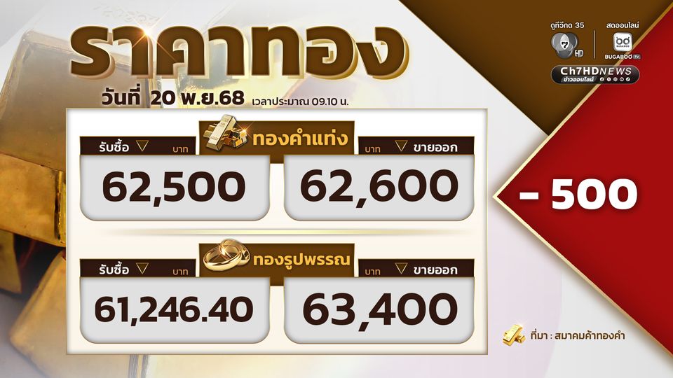 ราคาทอง โดยสมาคมค้าทองคำ รายงานราคาทองวันนี้ (20 พ.ย. 68) เปิดตลาดราคาทอง ราคาทองปรับลง 500 ขายออกที่บาทละ 62,600 บาท โดยทองคำแท่งรับซื้อที่ 62,500 บาท ขายออกที่ 62,600 บาท ทองรูปพรรณรับซื้อที่ 61,246.40 บาท ขายออก 63,400 บาท