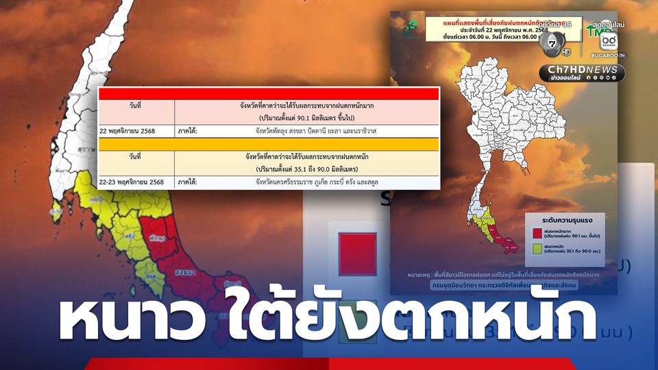 ภาคใต้มีฝนตกหนักหลายพื้นที่และมีฝนตกหนักมากบางแห่งในช่วงวันที่ 22-23 พ.ย. 68 เนื่องจากมรสุมตะวันออกเฉียงเหนือที่พัดปกคลุมอ่าวไทย ภาคใต้ และทะเลอันดามันยังคงมีกำลังค่อนข้างแรง ประกอบกับมีหย่อมความกดอากาศต่ำบริเวณภาคใต้ตอนล่าง ส่วนคลื่นลมบริเวณอ่าวไทยและทะเลอันดามันมีกำลังค่อนข้างแรง โดยอ่าวไทยมีคลื่นสูง 2-3 เมตร ส่วนทะเลอันดามันตอนบนมีคลื่นสูงประมาณ 2 เมตร ห่างฝั่งคลื่นสูง 2-3 เมตร บริเวณที่มีฝนฟ้าคะนองคลื่นสูงมากกว่า 3 เมตร