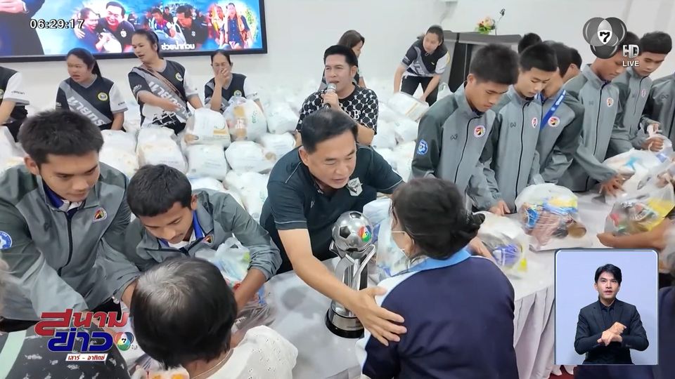 สนามข่าวเสาร์-อาทิตย์ - นักฟุตบอลโรงเรียน อบจ.ชัยนาท ลงพื้นที่ให้กำลังใจและมอบถุงยังชีพช่วยเหลือผู้ประสบอุทกภัย ในเขตจังหวัดชัยนาท