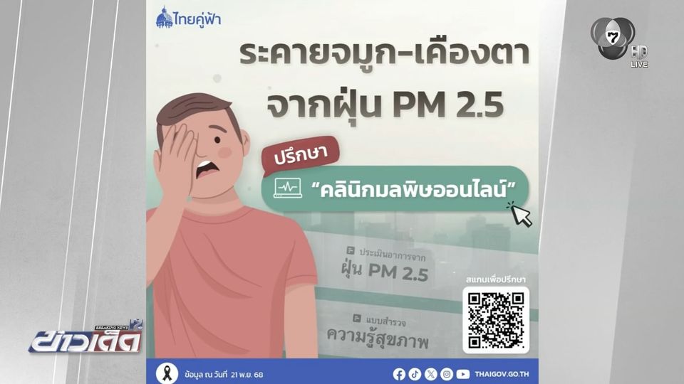 ข่าวเด็ด 7 สี - รัฐบาลเตือนประชาชน หากพบการระคายจมูก และเคืองตา จาก PM2.5 ขอคำปรึกษาจาก "คลินิกมลพิษออนไลน์" หรือสายด่วนกรมอนามัย กรมควบคุมโรค ตลอด 24 ชั่วโมง