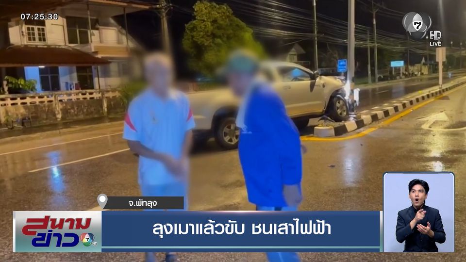 สนามข่าว 7 สี - ชายอายุประมาณ 65 ปี ขับรถพุ่งชนเสาไฟฟ้าส่องสว่างบนเกาะกลางถนน